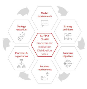 I. Die Identifikation der Parameter, die den Footprint der Supply Chain beeinflussen, sollte der erste Schritt der Analyse sein. Diese Parameter sind von Natur aus unterschiedlich und sollten definiert werden, bevor über Änderungen nachgedacht wird: (i) Marktanforderungen (einschließlich Vertriebskanäle, Lieferzeit, Auftragsart, usw.), (ii) die Unternehmensstrategie (einschließlich finanzielle/ESG2-Ziele, Marktposition, Mitarbeiterzufriedenheit, usw.), (iii) Standortanforderungen (Entfernung zum Kunden, Lieferleistung, Automatisierungsgrad, usw.) und (iv) Prozess und Organisation (zentral/dezentral, Lieferantenintegration, IT-Landschaft, usw.). Die Umsetzung von Optimierungsmaßnahmen in der Supply Chain erfordert ein ganzheitliches Verständnis der Thematik und der immanenten Veränderungen im Unternehmen.